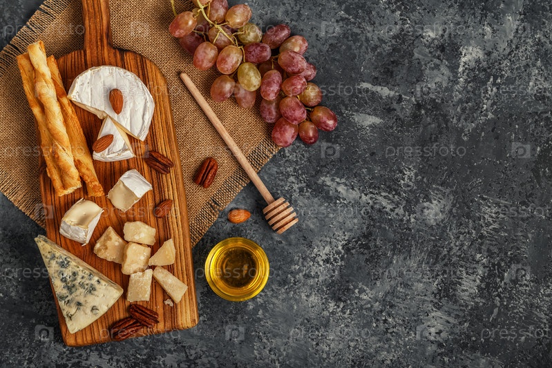 Ассорти из сыра с медом, орехами и виноградом на разделочной доске