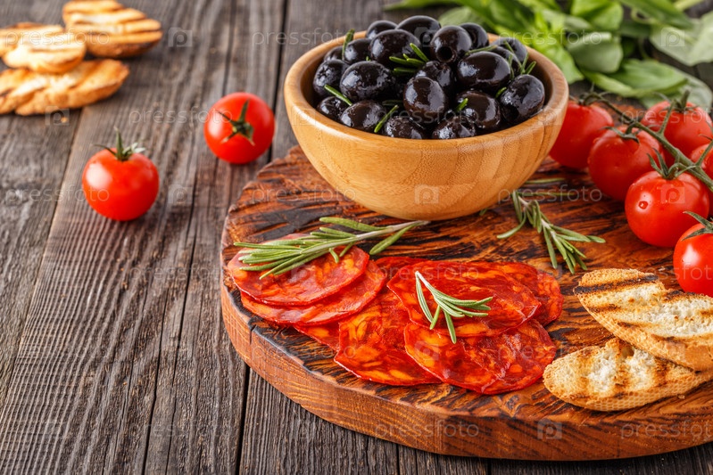 Испанская традиционная колбаса чоризо со свежей зеленью, оливками, помидорами