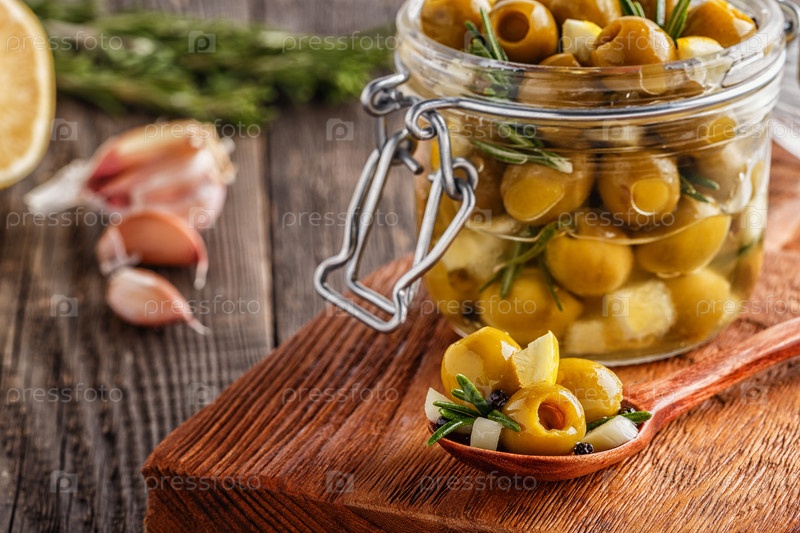 Свежие оливки с розмарином, чесноком, лимоном
