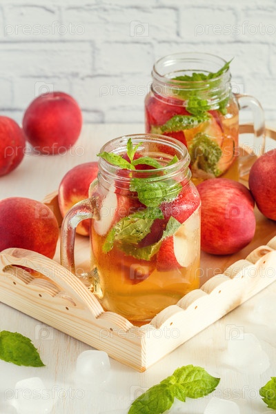 Домашний лимонад с персиками и листьями мяты
