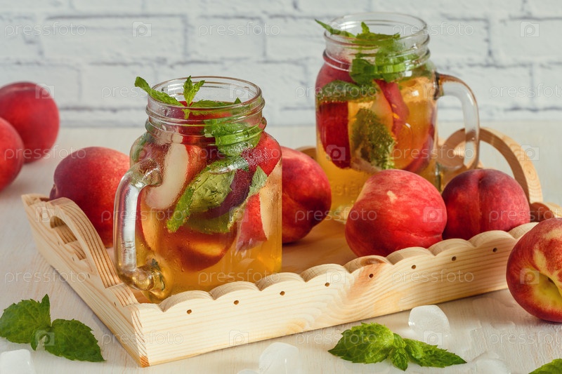 Домашний лимонад с персиками и листьями мяты