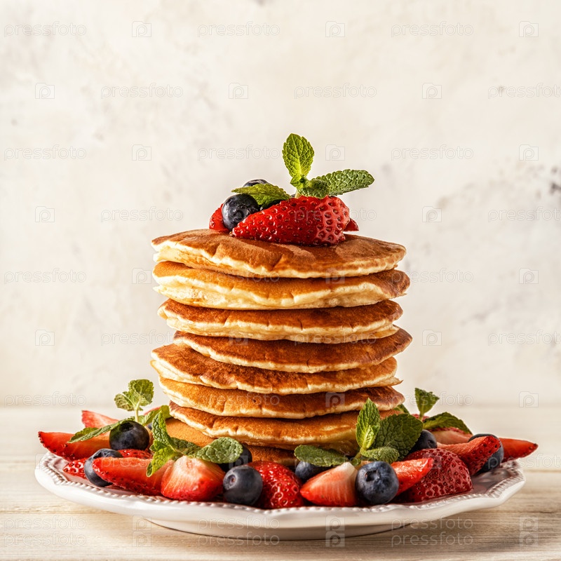 Домашние блины с ягодами и фруктами на белом фоне
