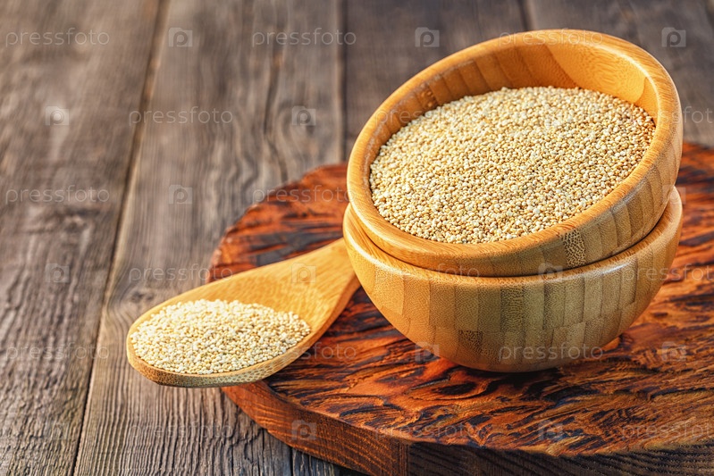 Белая киноа в деревянной миске