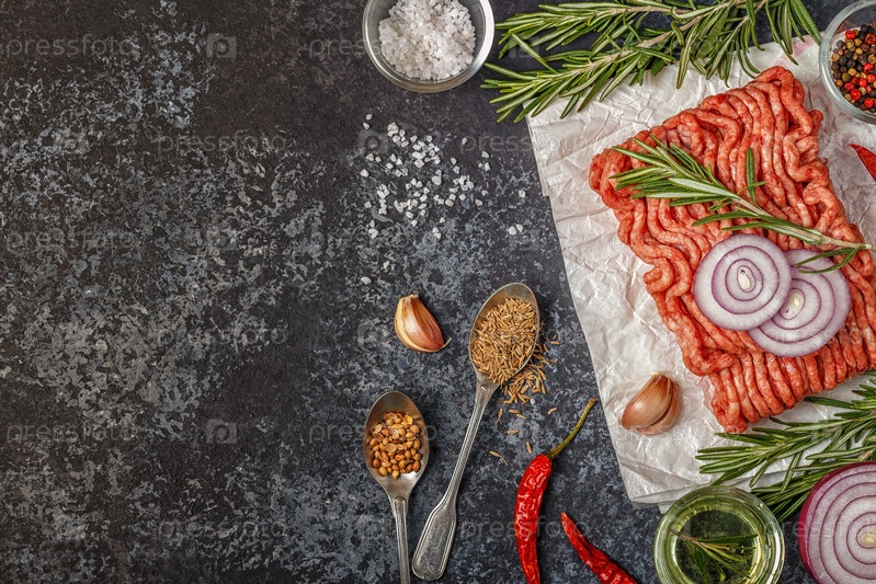 Сырой фарш на бумаге с луком, травами и приправами на бла