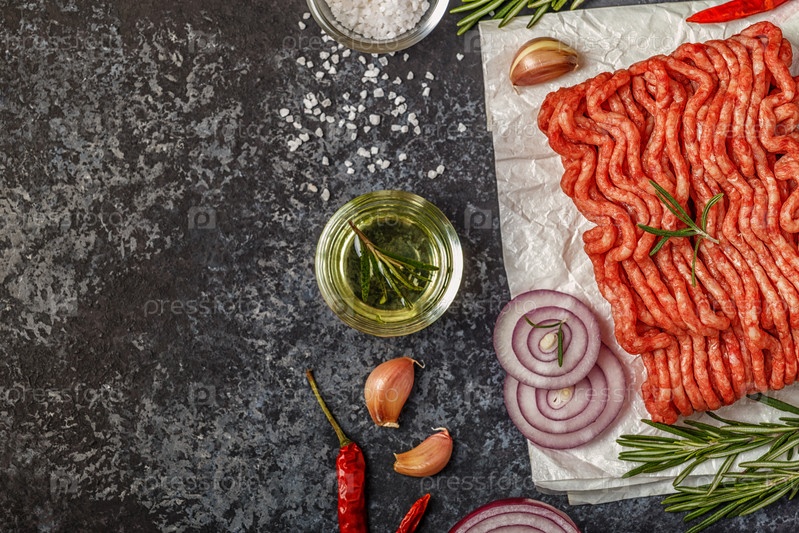Сырой фарш на бумаге с луком, травами и приправами на бла