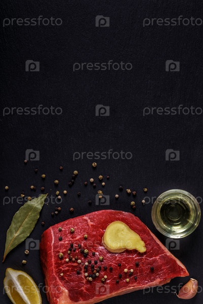 Сырой стейк со специями и ингредиентами для приготовления пищи