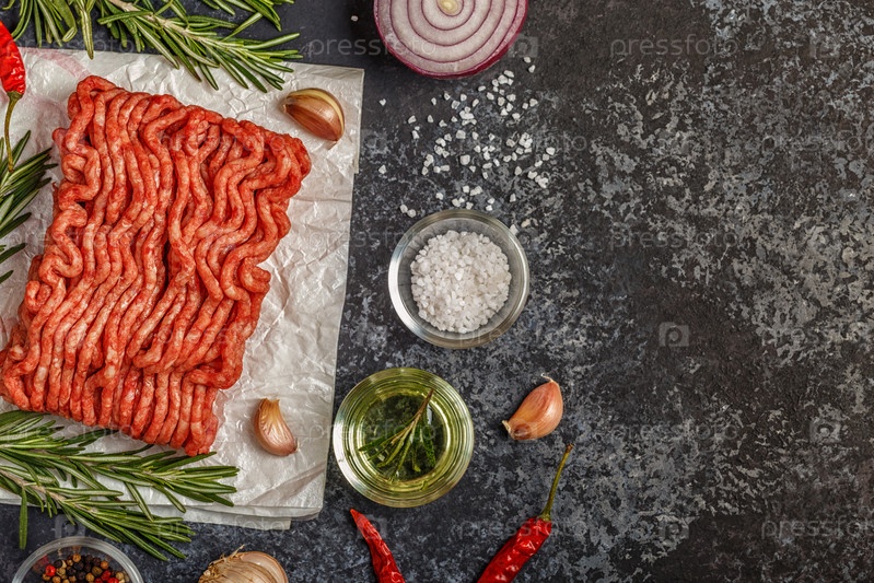 Сырой фарш на бумаге с луком, травами и приправами на бла