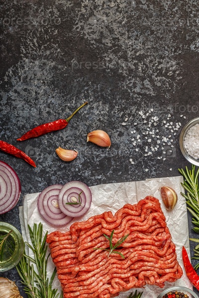 Сырой фарш на бумаге с луком, травами и приправами на бла
