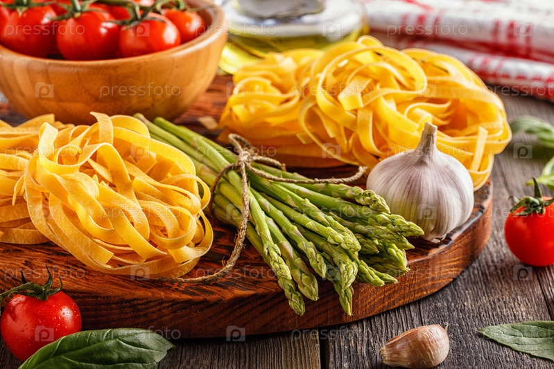 Продукты для приготовления пищи - свежая спаржа, макаронные изделия, оливковое масло