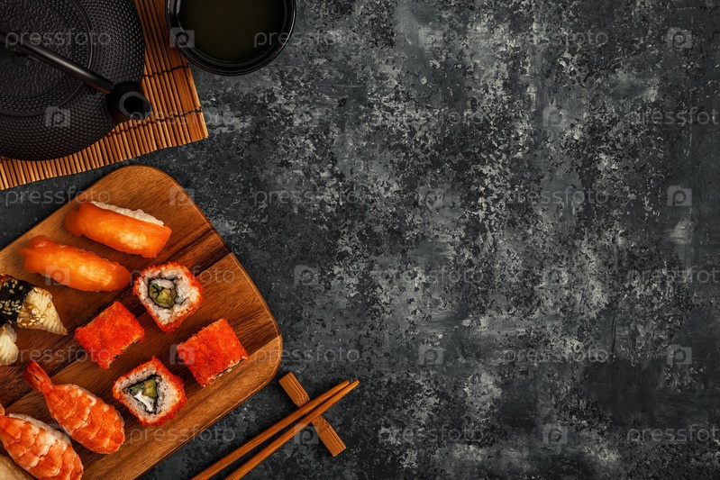 Суши-сет: суши и суши-роллы на деревянной тарелке