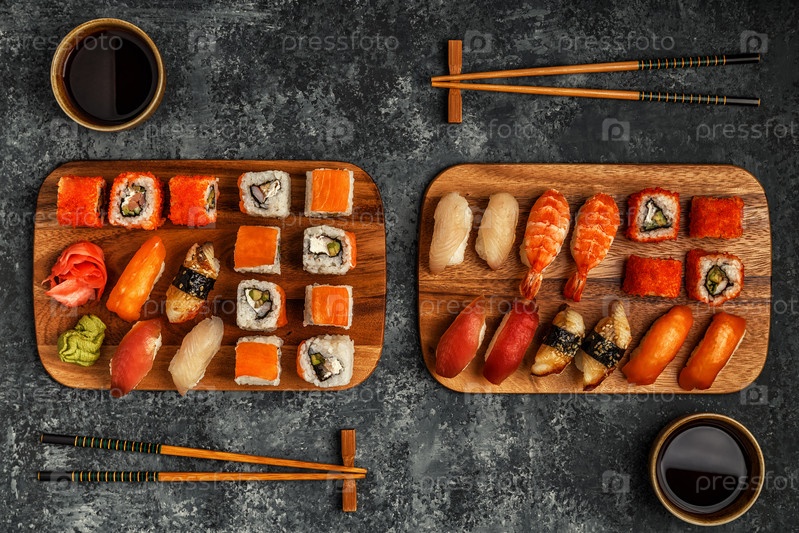 Суши-сет: суши и суши-роллы на деревянной тарелке