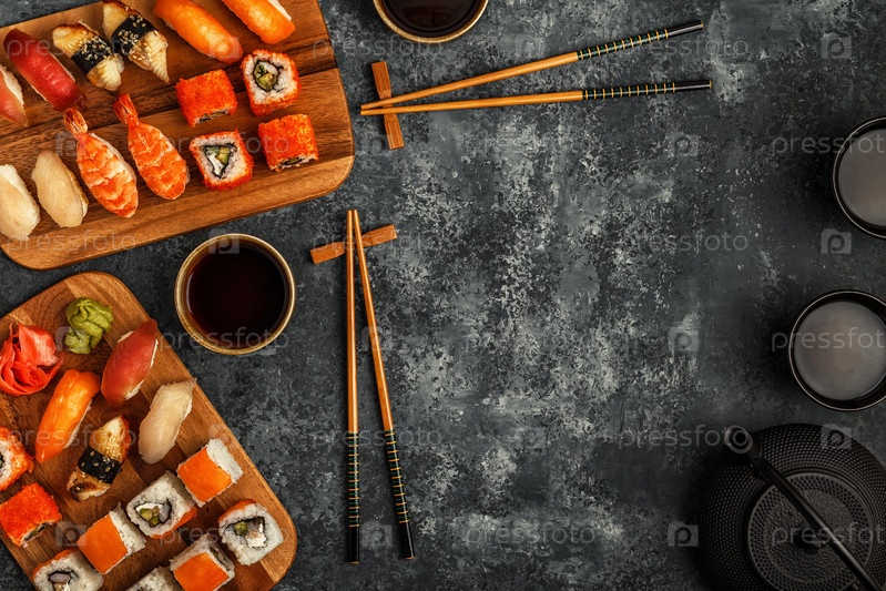 Суши-сет: суши и суши-роллы на деревянной тарелке