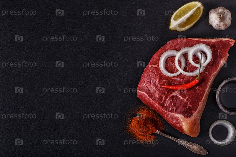 Сырой стейк со специями и ингредиентами для приготовления пищи