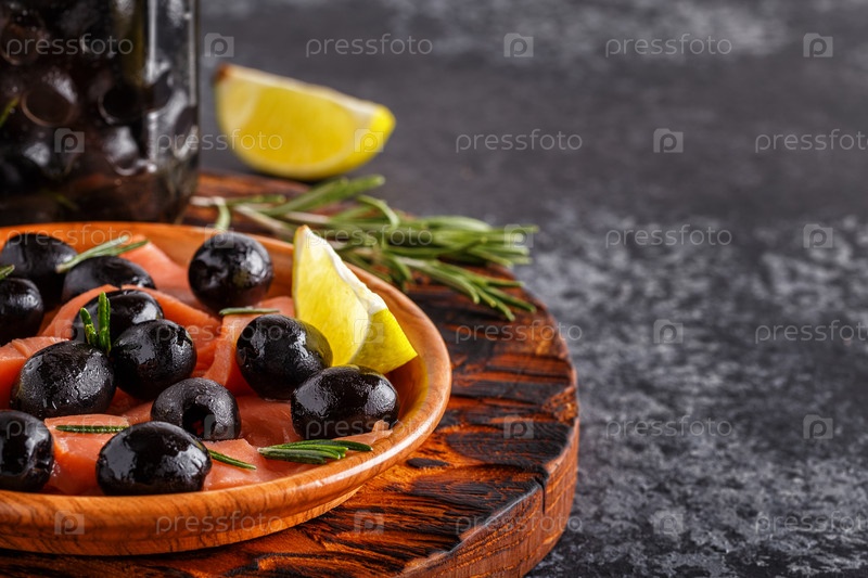 Лосось с оливками и лаймом на деревянной доске