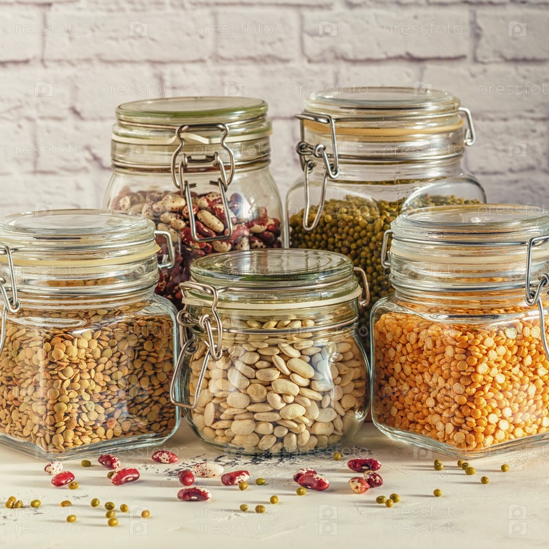 Стеклянные банки с различными бобовыми - фасолью, машом, горохом и леном