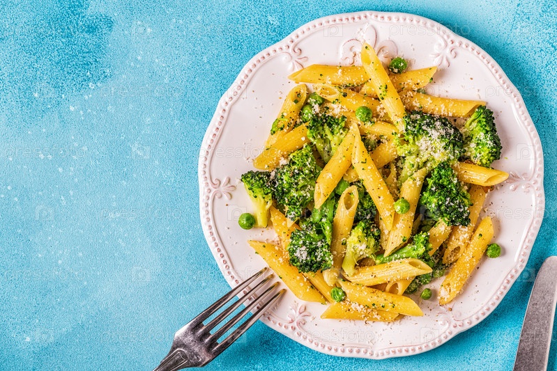 Паста с брокколи, зеленым горошком, чесноком, сыром