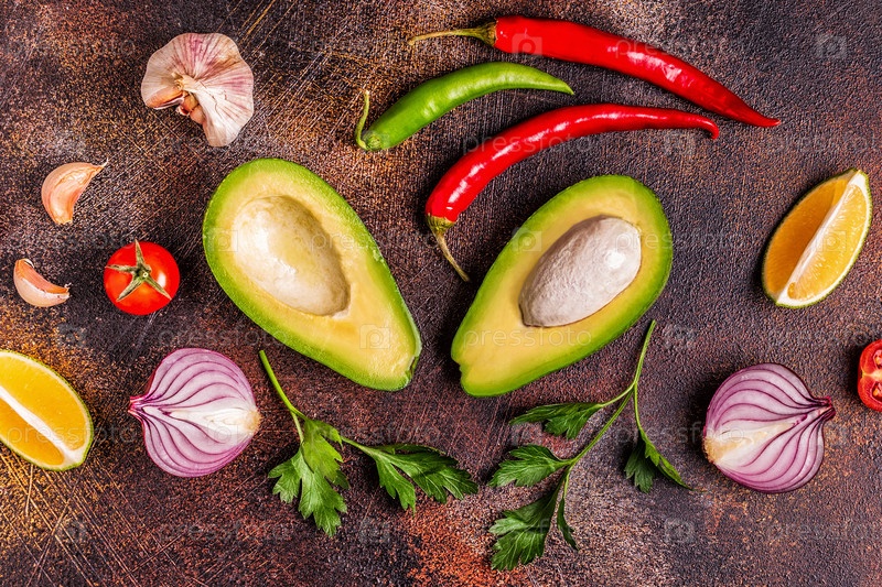 Ингредиенты для гуакамоле: авокадо, лайм, помидор, лук и специи