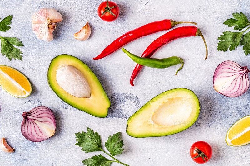 Ингредиенты для гуакамоле: авокадо, лайм, помидор, лук и специи