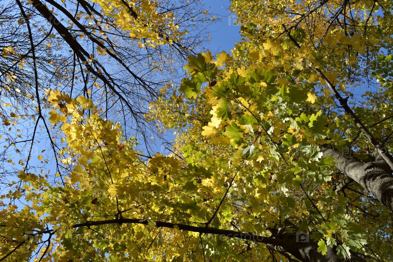 Кроны деревьев осенью на фоне голубого неба