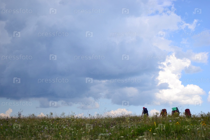 Туристы идут с рюкзаками по полю в пасмурную погоду