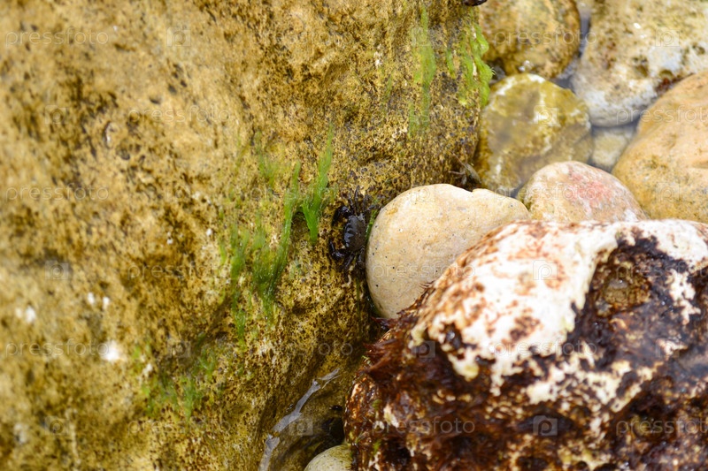 Крабы прячутся в больших камнях на море