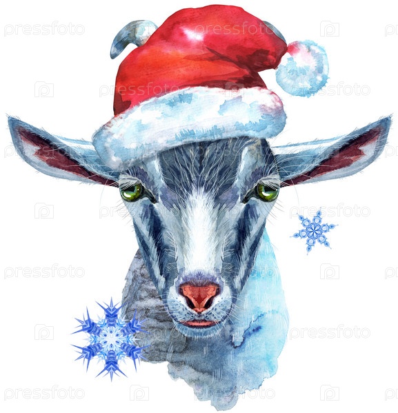 Персонаж козла в акварельной иллюстрации шляпы Санты на белом фоне