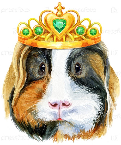 Акварельный портрет морской свинки Шелти с золотой короной на белом фоне
