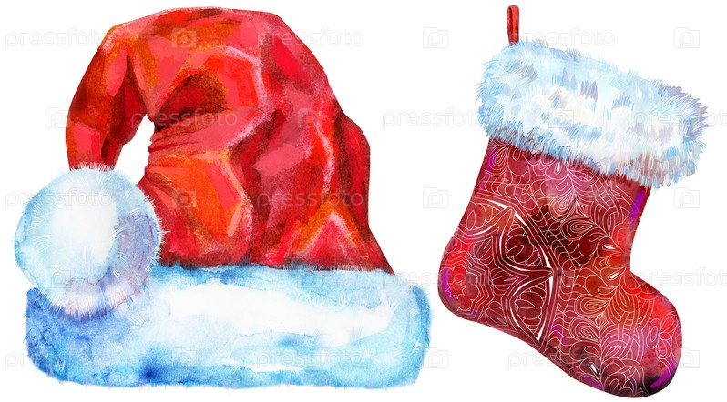 Рождественская красная шапка Санты и носок в подарок, акварельная иллюстрация
