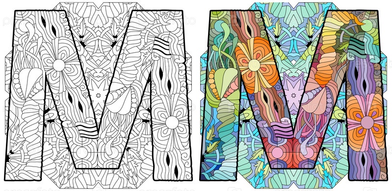 Zentangle стилизованный алфавит - буква М на мандале для окраски. векторная иллюстрация. этнический узор, множество цветов и контуров