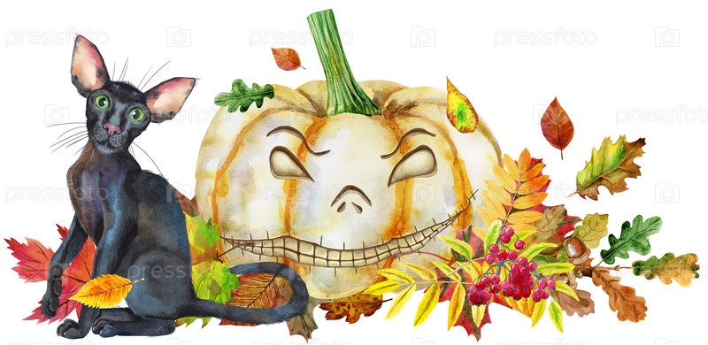 Черный кот с тыквой и осенними листьями