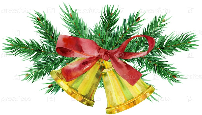 Золотые акварельные рождественские колокола с еловыми ветвями красного банта. Символ счастливого Рождества и Нового года