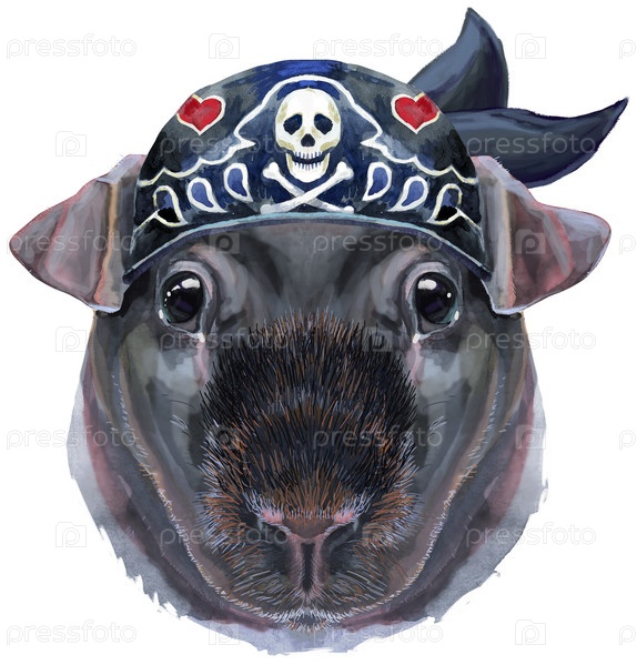 Акварельный портрет тощей морской свинки в байкерской бандане на белом фоне