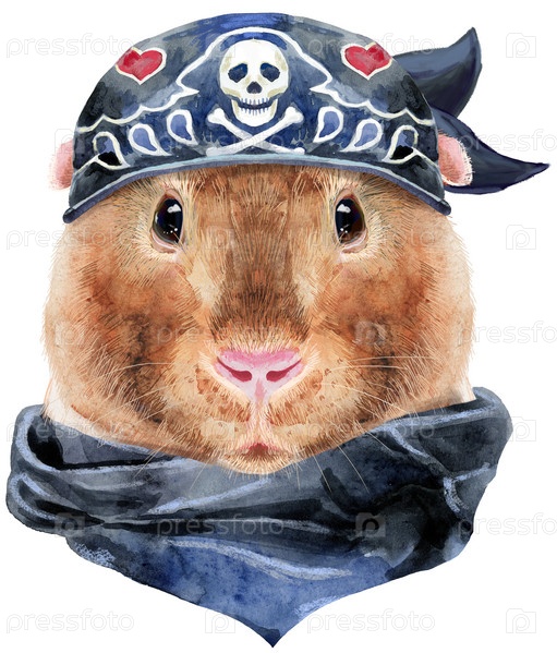 Морская свинка в байкерской бандане. Свинья для графики на футболках. Акварельная иллюстрация морской свинки Тедди