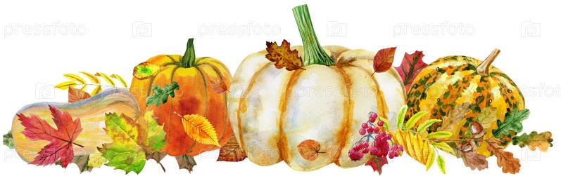 Осенние листья с тыквами на белом фоне, осенний урожай