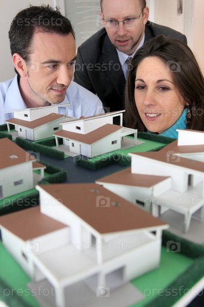 Архитектор показывает модель дома покупателям