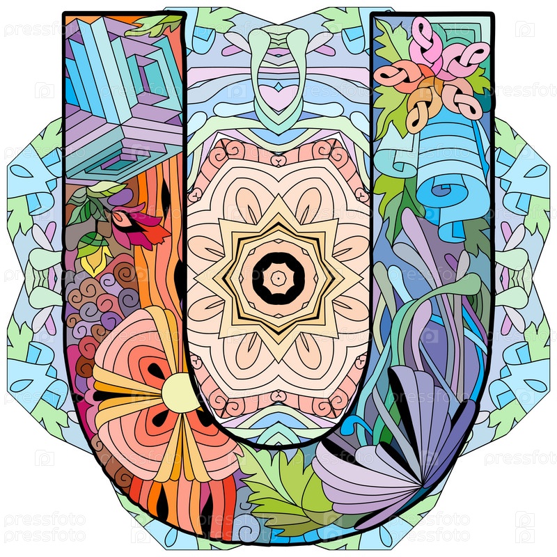 Монограмма буквы U с мандалой, гравировка. векторная иллюстрация
