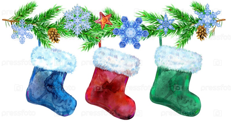 Рождественские разноцветные носки с белым мехом и еловыми ветками. Акварельная иллюстрация. Изолированный