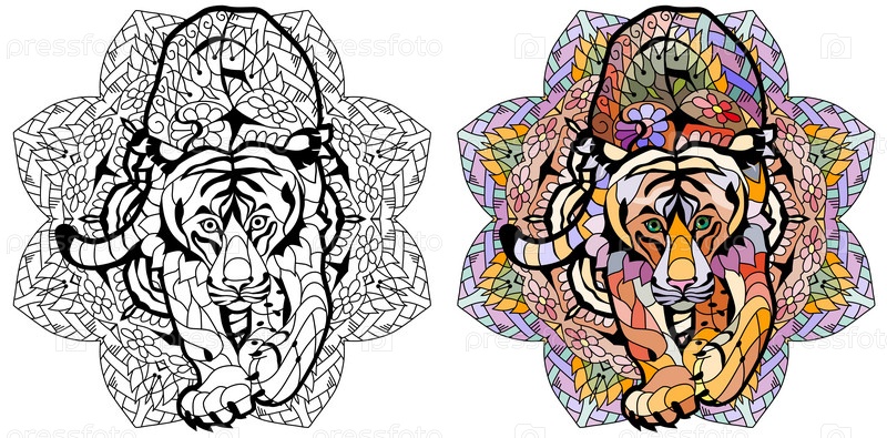 Тигр в стиле зентагле с мандалой для дизайна футболки, красок, татуировок и других украшений