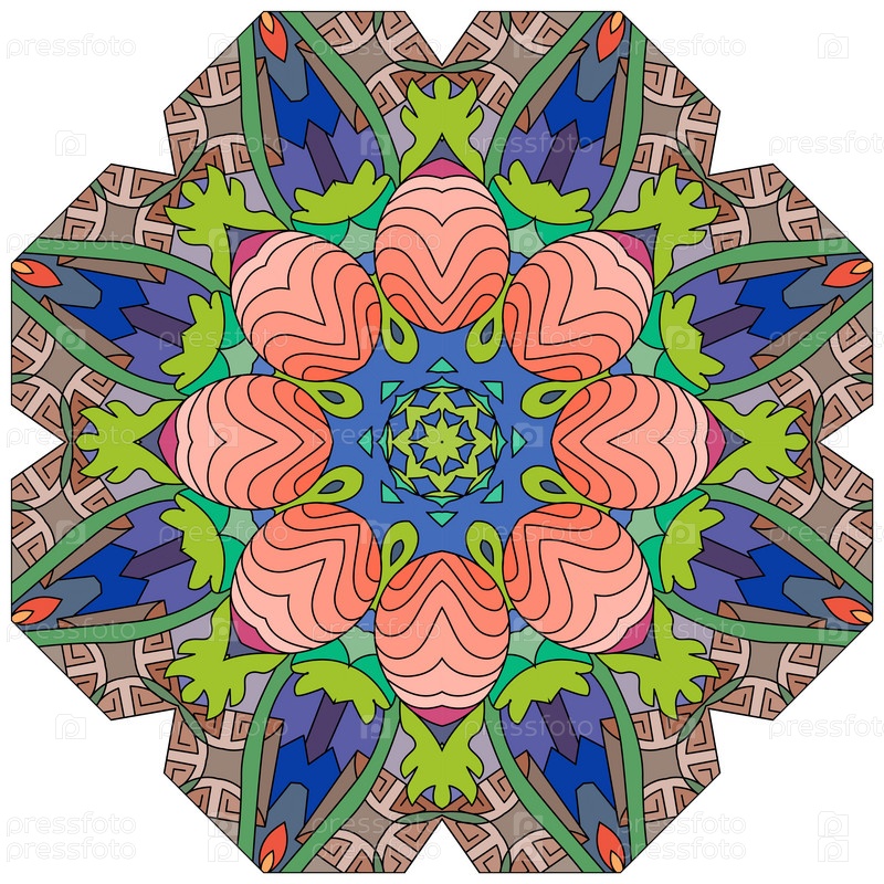 Декоративный круглый орнамент. Необычная форма цветка. Восточный вектор, схемы антистрессовой терапии. Переплетение элементов дизайна. Вектор логотипов йоги