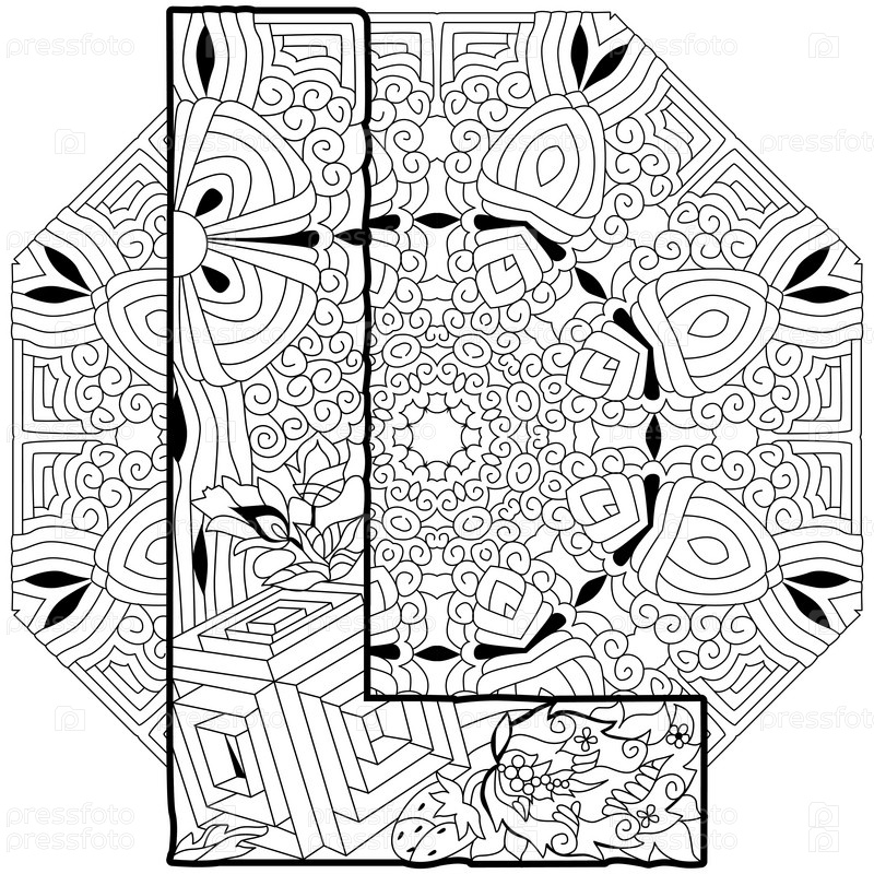 Zentangle стилизованный алфавит - буква L на мандале для окраски. векторная иллюстрация. этнический узор