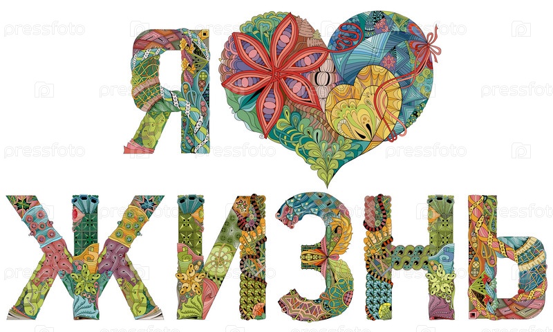 Художественный дизайн ручной росписи. Нарисованные вручную слова иллюстрации Я ЛЮБЛЮ ЖИЗНЬ на русском языке для футболки и других украшений