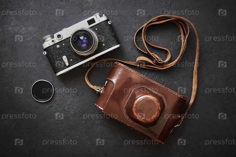 Старая потрепанная ретро-камера и кожаный чехол на черном графитовом фоне крупным планом, плоская планировка