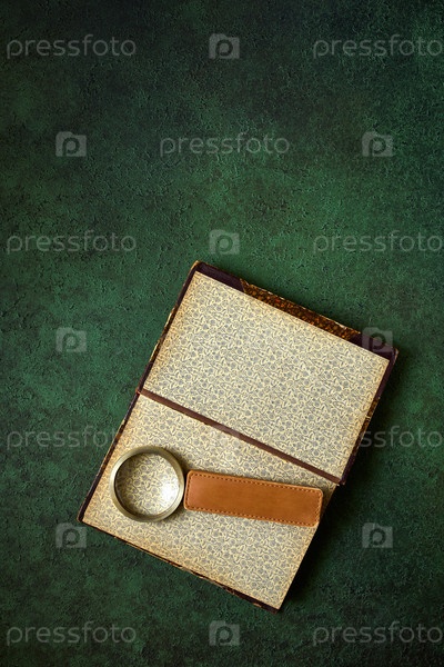 Открытая старинная старая книга и лежащее на ней увеличительное стекло, зеленый фон с копией пространства