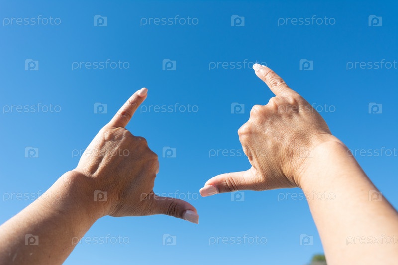 Женские руки, показывающие знак серфера на фоне голубого неба,