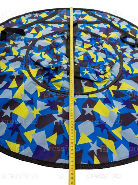 Саночная трубка для зимнего активного отдыха на природе в сдутом состоянии с рулеткой наверху. Вид сверху. Изолированные на белом фоне