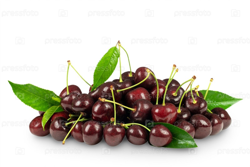 Куча сладких влажных вишен с зелеными листьями. Дизайн этикетки продукта, печать каталога. Изолированные на белом фоне с мягкой тенью