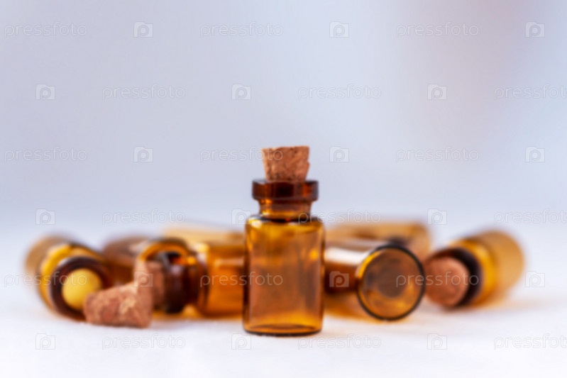 Расфокусированное фото фармацевтических флаконов янтарного цвета. Копировать пространство
