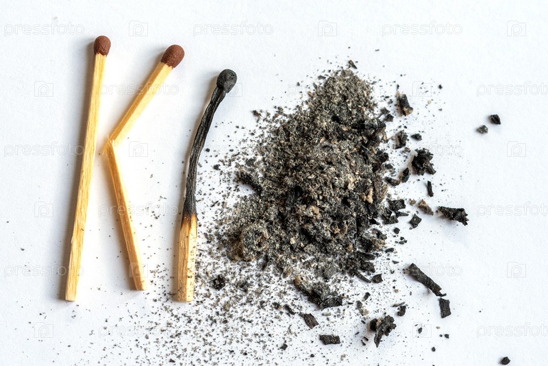 Спички и куча пепла на светлом фоне. Выборочный фокус