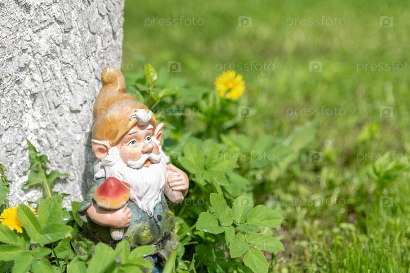 Фигура садового гнома под деревом в зеленой траве. Копировать пространство