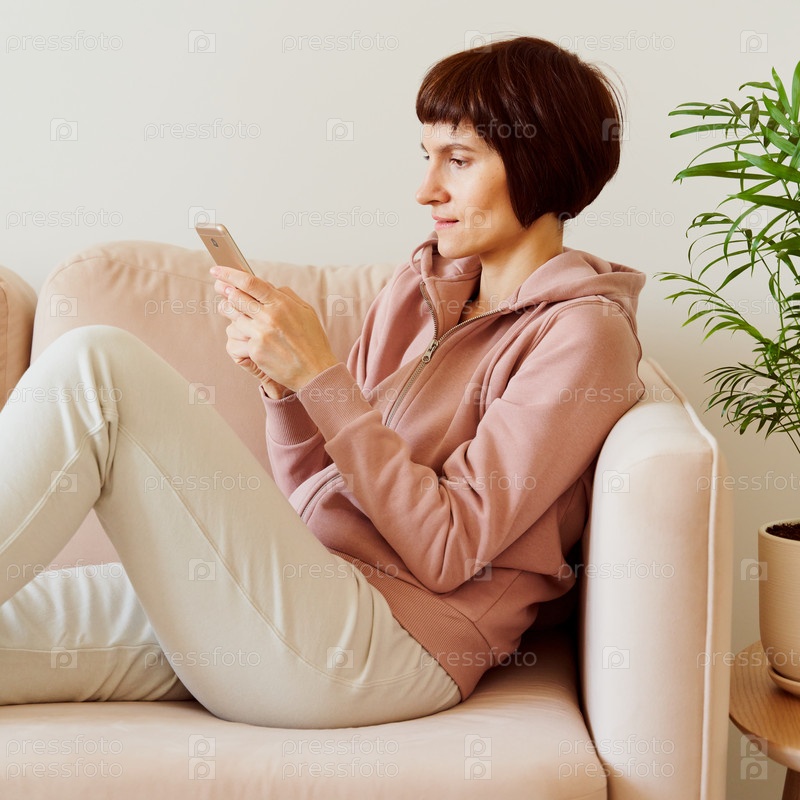Портрет зрелой женщины, ищущей социальные сети на мобильном телефоне. Женщина средних лет в домашней спортивной одежде пастельных тонов сидит на диване и разговаривает в аудиочате с друзьями. Красивая улыбающаяся дама